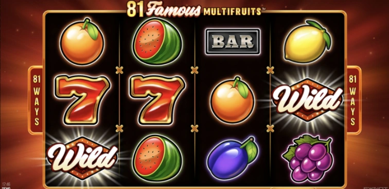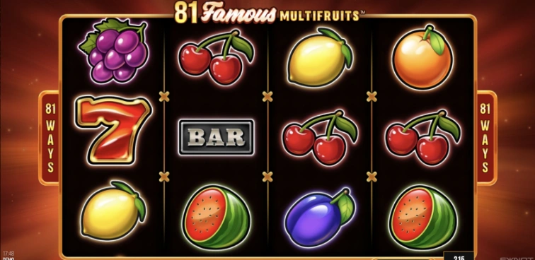 Automat 81 Famous Multi Fruits má 4 valce a 3 riadky, čo už napovedá jeho názov – ponúka až 81 výherných línií. Kombinácie sa počítajú v jednom smere, zľava doprava. Na výhru potrebujete roztočiť aspoň 3 alebo 4 rovnaké symboly vedľa seba, začínajúc od prvého valca vľavo. Okrem tradičných ovocných symbolov sa na valcoch točia aj BAR-y a sedmičky. Symboly BAR majú najnižšie odmeny, zatiaľ čo sedmičky sú na vrchole. Keď sa vám podarí získať červenú sedmičku na všetkých 4 valcoch, vaša stávka sa násobí až 160-krát.